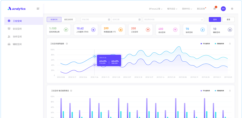 基于传感器和预约数据的DFocus耘申科技企业空间数据分析系统,能帮助企业客户更加了解其空间使用情况,优化空间分配,提升使用率,节省成本,并改善员工工作环境,提高沟通协作和工作效率